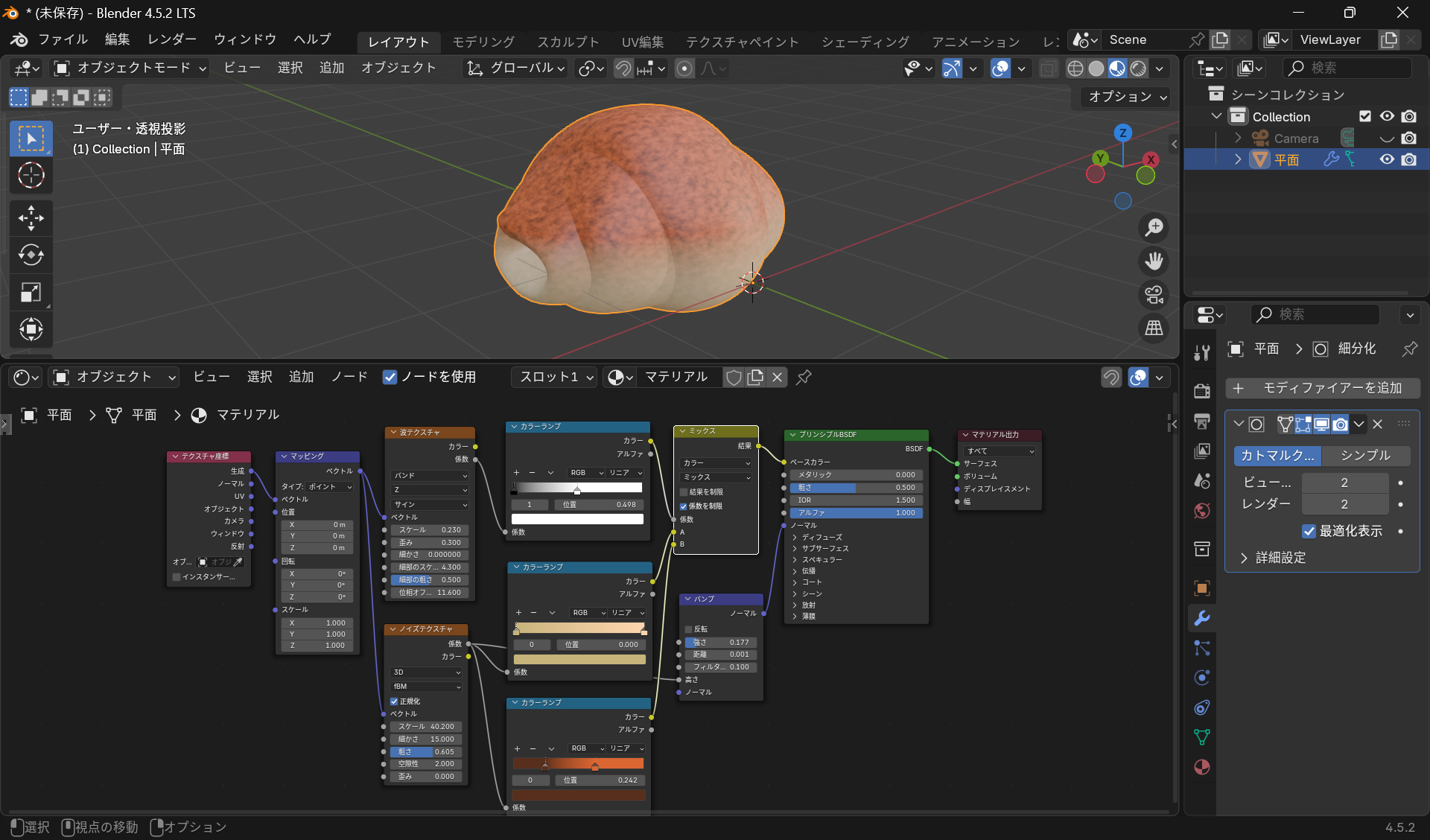 Blender「クロワッサン」 2025.09.30 を作るだけで、このノードの複雑さで、数値をいろいろいじります。 これでも、初心者向けのシェーディングの基本のきです。 焼けたパンの表現をつけるために、これだけの手間がかかります。