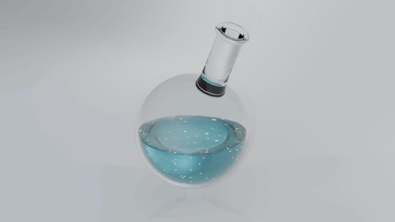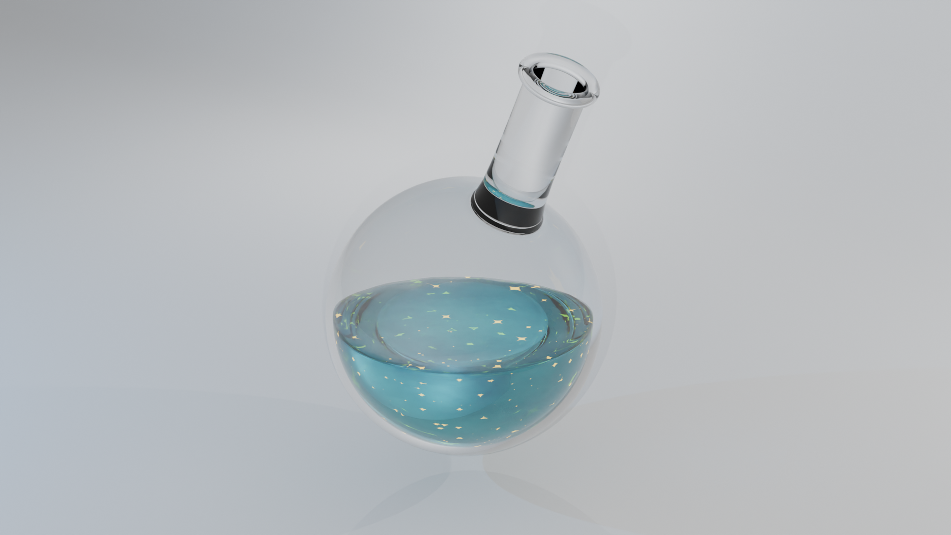 Blender「液体の入ったフラスコ」 2025.09.30 レンダープロパティーの最大サンプル数を「64」でも、書き出しに数分かかってしまいます。こういう3Dの制作にはGPUは必須だと痛感させられます。